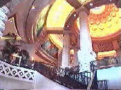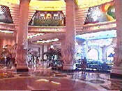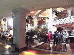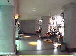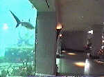 Inside the hotel, the restaurant area of the lobby forms one side of the major aquarium. Viewers in the lobby can look through wide, floor to ceiling, glass portals to gaze upon large sharks while dining in the restaurant--as the panorama below depicts.