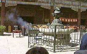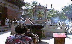 A monk tends the items used for devotional activities. Smoke from sweetly-scented incense drifts skyward. A worshipper kneels before a religious figure.