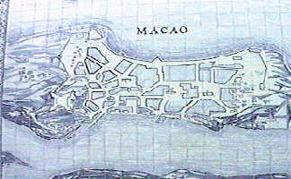 It's not a very large place. A day's excursion gives plenty of time for persons who are interested only in seeing the principal sights. The map below is from a series of tile murals that line an arcade leading to the historic gateway to China. The murals depict Macau's development as a European colony--a status that will change in 1999 when it reverts back to China.