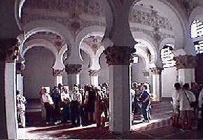 In Toledo we also visited the synagogue of Santa Maria la Blanca. You'll recognize that "Santa Maria" is a strange name for a synagogue. Synagogues don't normally get named after saints. The explanation is that, after the jews were expelled from Spain, the synagogue was turned into a Catholic chapel and re-named. (It's a little bit like happened in Istanbul--but in reverse--when the moslems turned the church of Santa Sophia into a mosque.) The synagogue is beautiful. It mandates respect. An aura of peace abounds within it. The capitals of the columns are intricately decorated. The graceful arches and the soft lighting promote harmony and repose. You've got to be moved by it!
