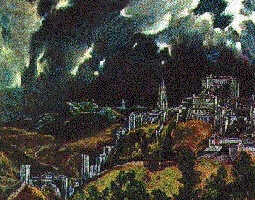 Not a blast furnace in sight! Nevertheless Toledo artisans continue to sell outstanding cutlery and collectible swords. For our son, who is an outdoor enthusiast, we bought a bowie knife with a blade of vanadium and molybdenum steel that should hold a scalpel-sharp edge through the roughest use. The best thing about Toledo is how a visitor feels transported back to the middle ages. There are narrow, winding pedestrian walkways. The streets twist and turn. They give little sense of sustained direction, The cobblestones can threaten balance, and foot travelers are occasionally challenged by some pronounced inclines. Still, it's fun to snake through the town's winding passages. Toledo has a Cathedral. It also has a synagogue--dating back to 1180, long before the jews were expelled from Spain. It has an Alcazar (a palace). It has the remnants of city walls. Just across the river Tagus are the battlements where the movie El Cid was filmed. So Toledo is a strong reflection of things that are medieval. But mostly, Toledo has Domenikos Theotocopoulos--EL GRECO! |