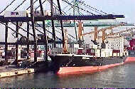 Algeciras was a modern and extremely busy port. As the ferry exited the port, it passed huge facilites for container ships. The machinery operated with such efficiency that cranes were loading cargo onto the forward part of a ship while in-coming cargo was still being off-loaded from the stern! |