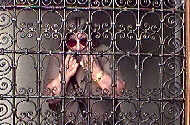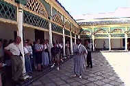 The Bahia Palace had beautifully tiled rooms. It also had a peaceful garden. One of the largest and most impressive areas, however, was the space allocated for concubines and favorite wives. The area for concubines was a spacious courtyard (below on the left). On the right, Dot pulls up her shirt collar to mimic a veil, and clowns at the window of the apartment for the "favorite wife." That's the perfect spot for her because you betcha she's MY favorite!